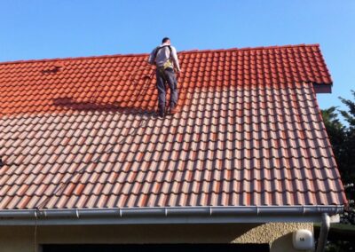 Nous procédons d’abord à un brossage ou un nettoyage à basse pression pour retirer les mousses et débris végétaux sans abîmer la surface de vos tuiles.